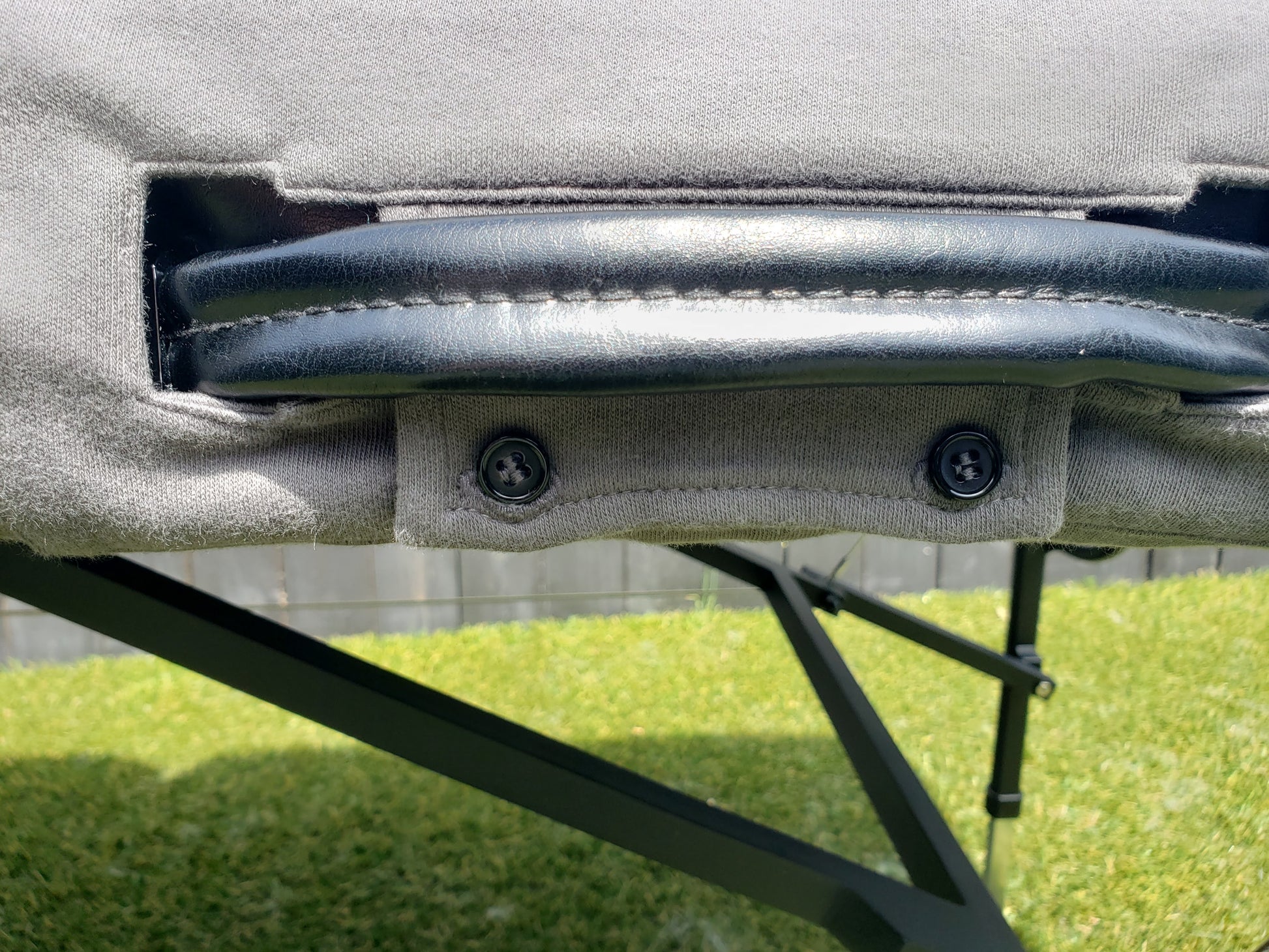 100% Cotton, plastic buttons and a bit of elastic to keep the cover snug on your table